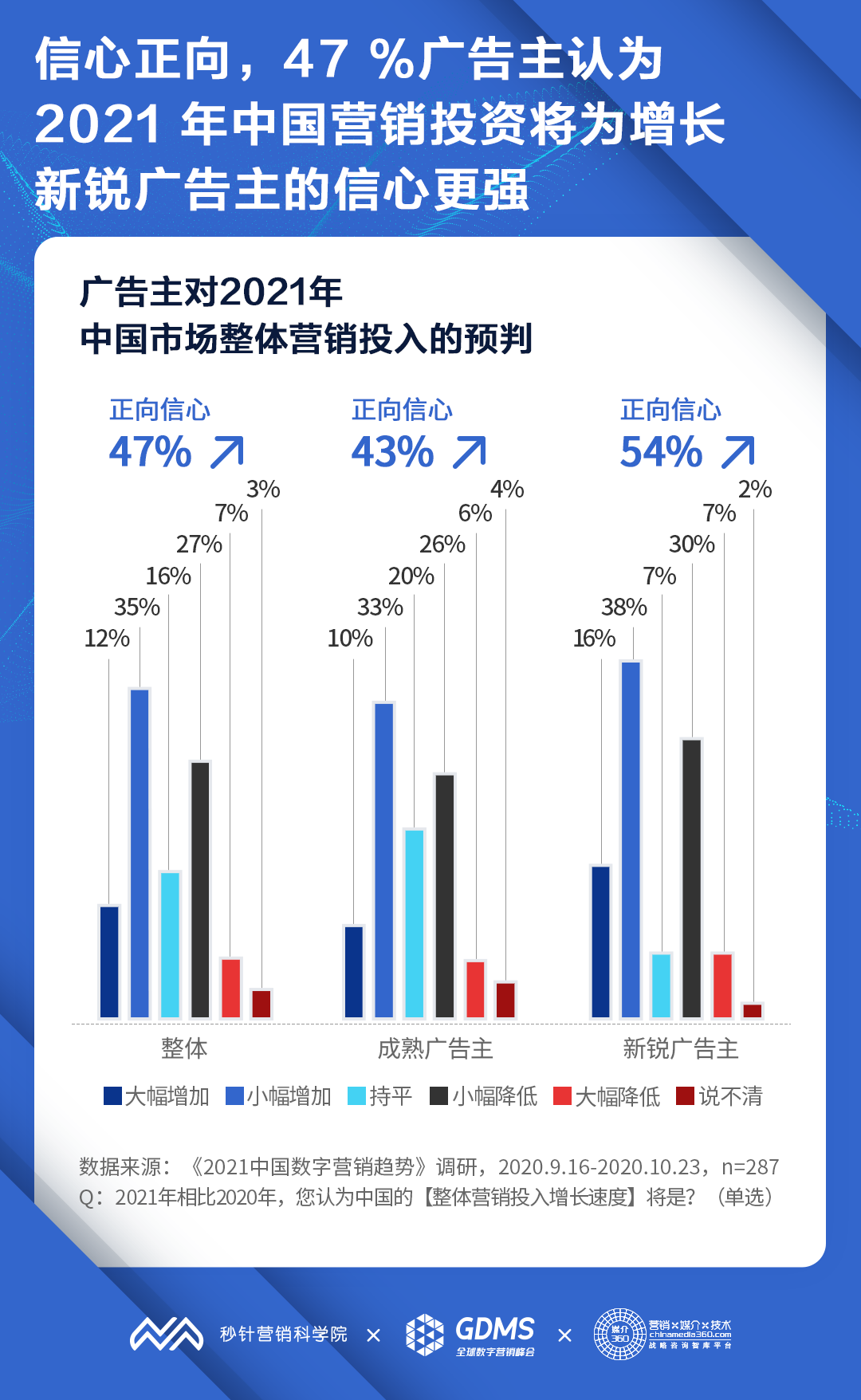 投资信心:47% 的广告主认为 2021 年中国营销投资将增长,营销投资信心整体正向,新锐广告主较成熟广告主信心更强;
