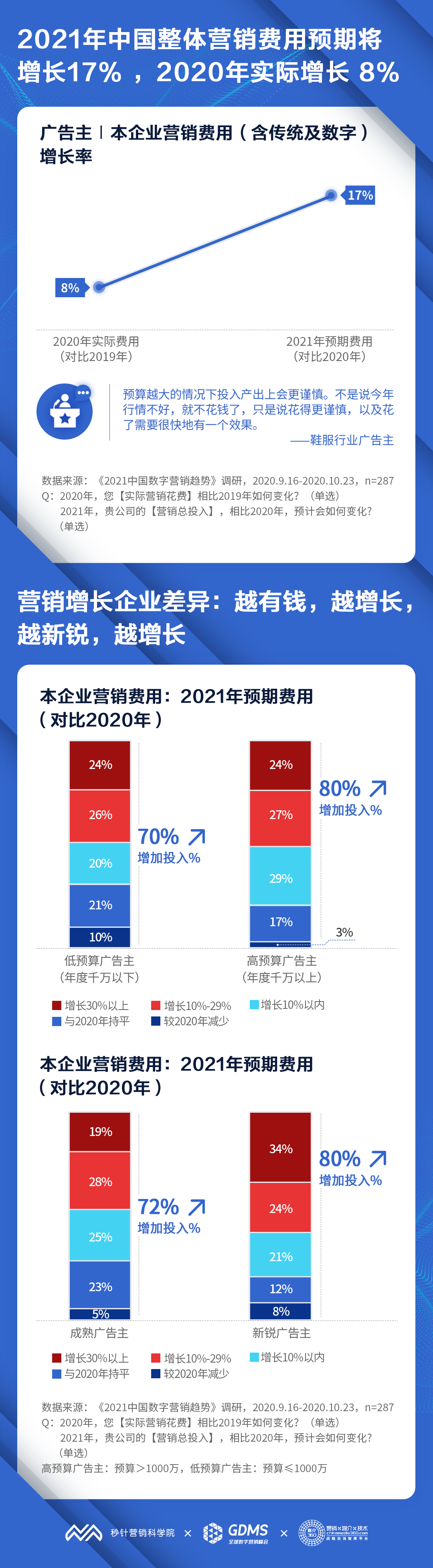 营销增速:2021年企业营销整体费用预期增长17%,高预算和新锐广告主增加投入的比例高于低预算和成熟广告主,2020年实际增长率为 8%;