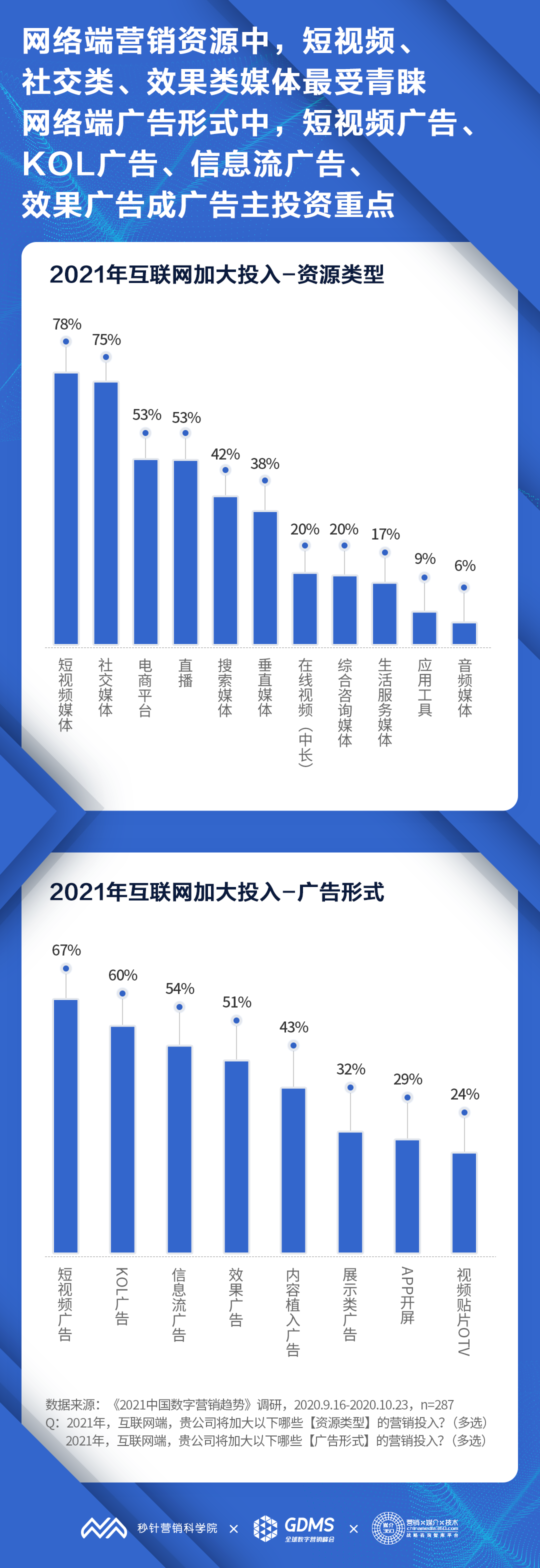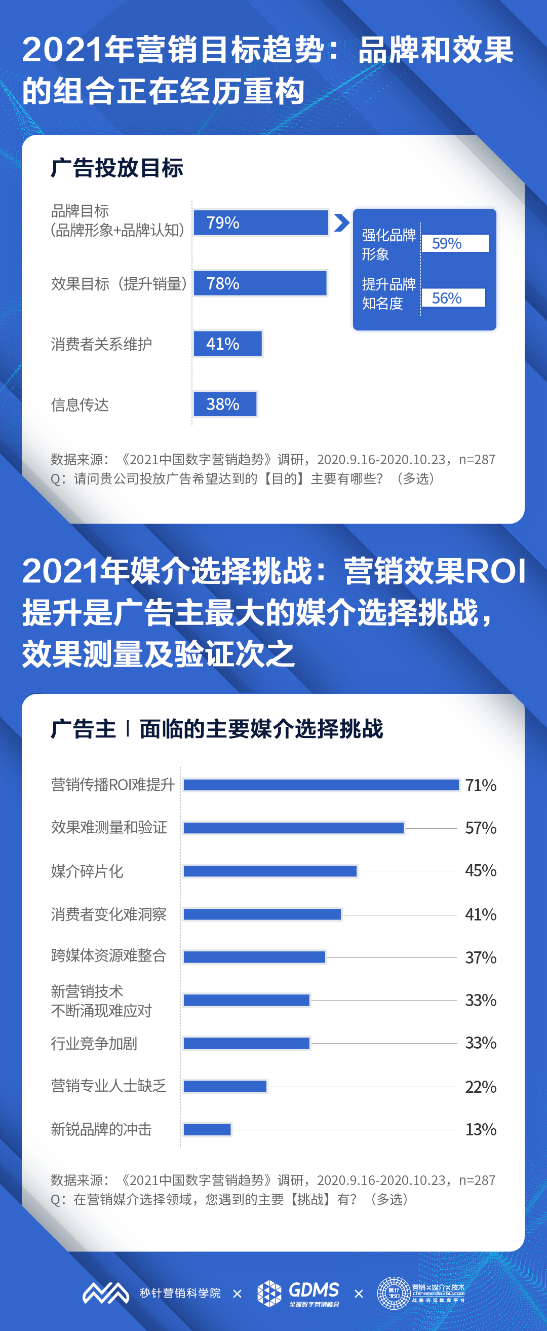 基于对食品饮料、美妆个护、医药保健、家用电器、教育培训、汽车、3C、婴幼儿食/用品等20多个行业的287位广告主进行调研,结合对代表性广告主进行1v1深访及案头研究,《2021中国数字营销趋势报告》对2021年中国营销行业增速、目标与挑战,不同媒介的投资趋势、重点投放的资源类型及广告形式、受关注的营销技术、概念、形式,当下主要营销热点进行了预测、洞察和分析。