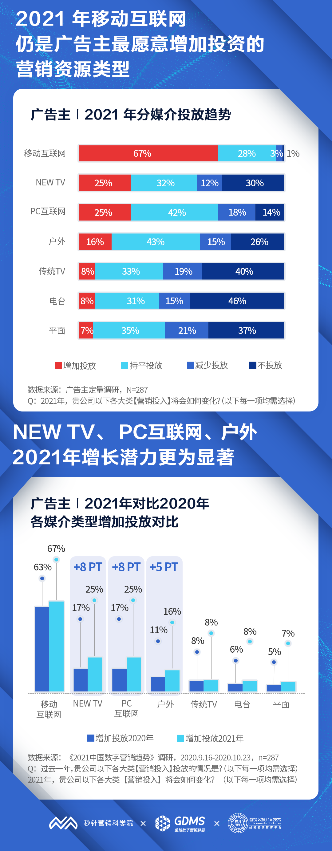 媒介投资:2021年移动互联网仍是广告主最愿意增加投资的营销资源类型, NEW TV和PC互联网的增长潜力更为显著,户外随其后;