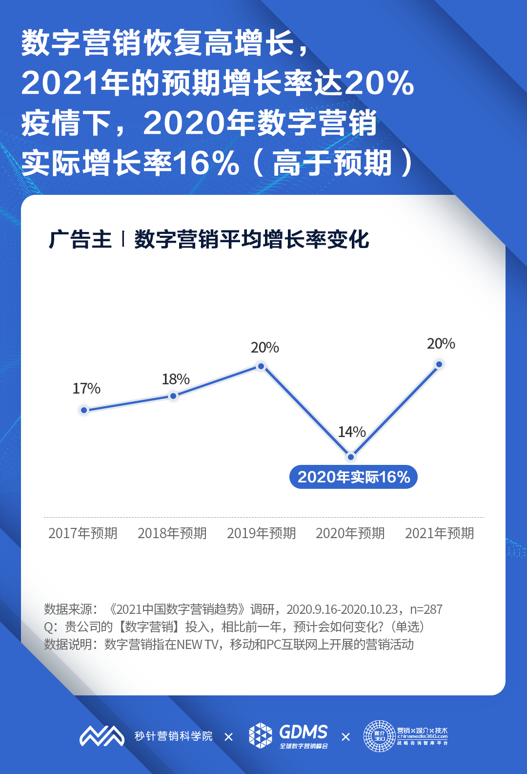 数字营销:2021年中国数字营销费用预期增长20%,重回疫情前水平,2020年实际增长16%,78%的广告主表示将增加数字营销预算;