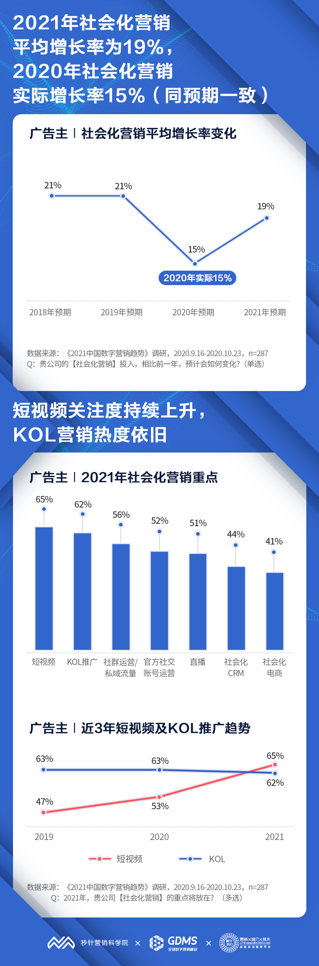 社会化营销:2021年社会化营销费用预期增长19%,2020年社会化营销实际增长率为15%(与2020年预期一致),短视频和KOL是社会化营销重点;