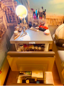 一个白色两层高的小冷柜,冷柜上面摆放了化妆刷、洗面仪等生活用品,就像一个化妆台;打开冷柜抽屉,里面还摆满了面膜、面霜、眼霜等化妆品……这就是海尔冷柜升级的新一代网红柜。