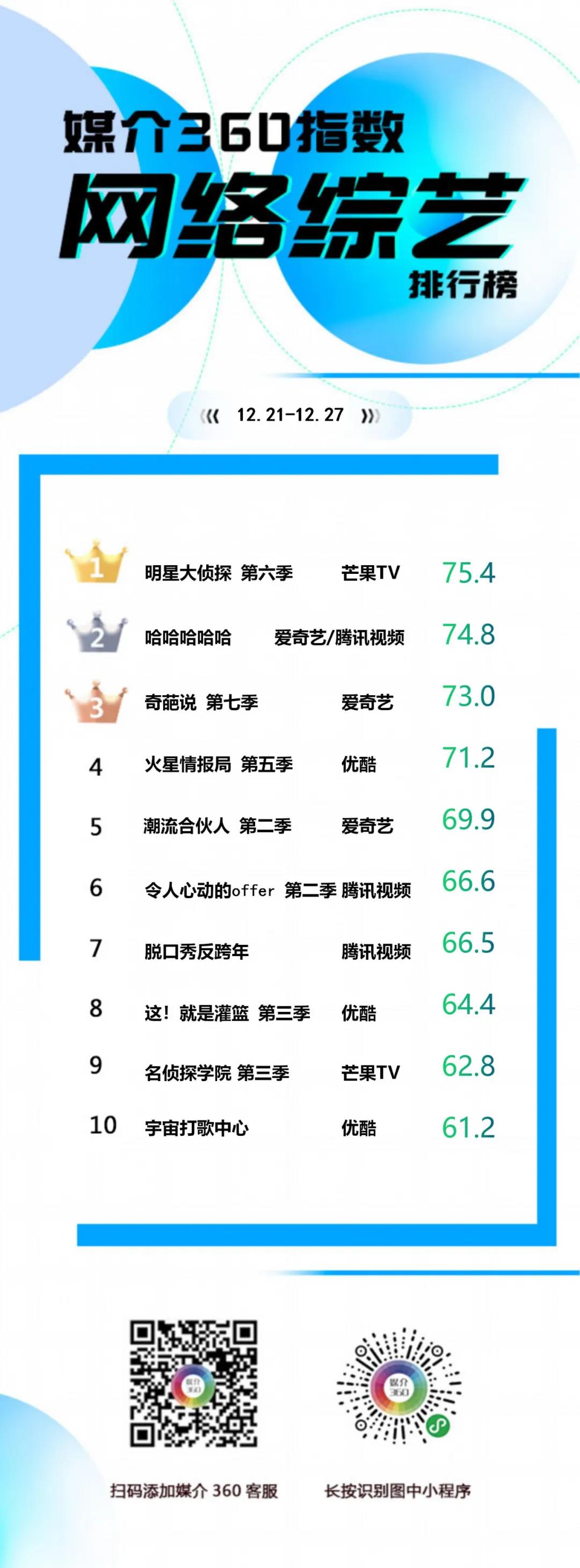 芒果TV《明星大侦探6》强势来袭,空降榜单第一;《哈哈哈哈哈》保持较高热度,排名榜单第二;爱奇艺《奇葩说7》紧随其后,占据榜单第三;优酷《火星情报局5》热度不减;位列榜单第四;《潮流合伙人2》暂列榜单第五。