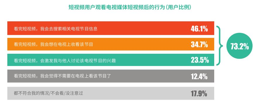 《短视频用户价值研究报告2018-2019》报告相关数据显示,电视节目以短视频形式在网络上传播,对用户关注电视内容有积极影响。电视节目短视频使73.2%的短视频用户对电视节目产生了兴趣,包括在看完短视频后「搜索电视节目(46.1%)」「收看电视(34.7%)」「讨论电视节目(23.5%)」。