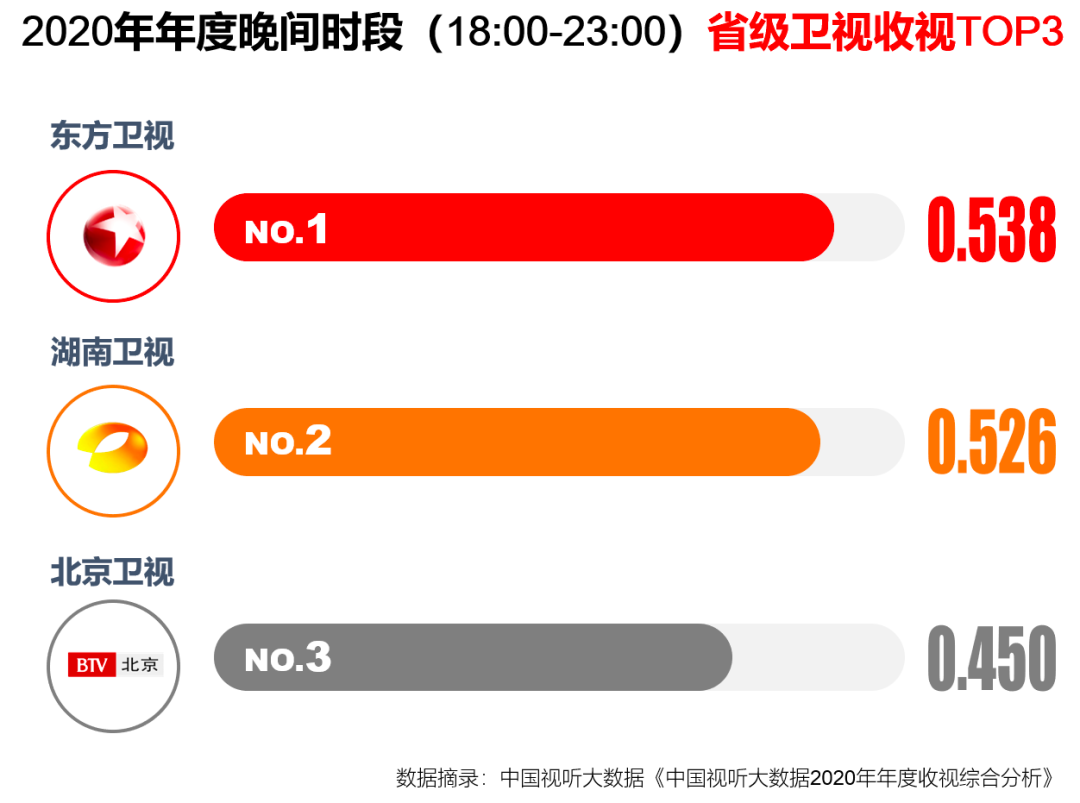 在2020年电视“主场”之争中,东方卫视脱颖而出,实现“从三跨一”的历史性突破。以电视大屏为基础点,利用平台强大的内容制作实力和积极迅速的应变能力,无论综艺、电视剧,还是晚会,东方卫视都擎住了行业标杆。