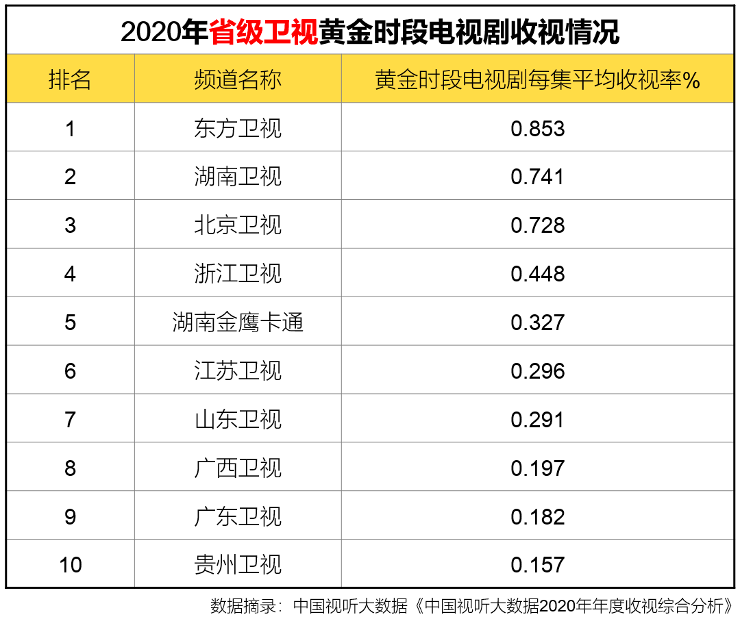 东方卫视2020全年黄金时段电视剧每集平均收视率0.853%,位列卫视黄金剧场第一。