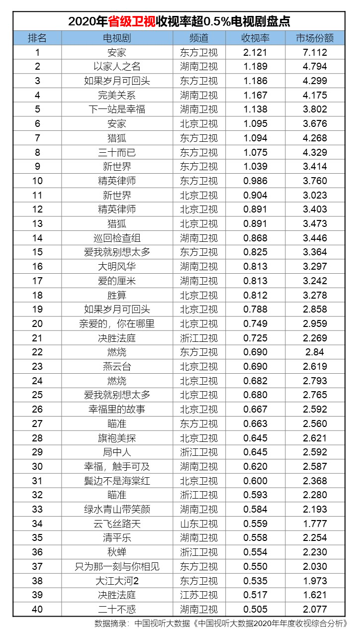反映中国人居住观念的变迁的《安家》,凭借演员精湛的演技和紧凑的剧情,获得好评,是唯一最高收视破3%的电视剧(总局大数据),剧王之冠无可争议。《三十而已》聚焦城市女性生活状态,发散出众多关于女性的议题,成为年度话题剧。