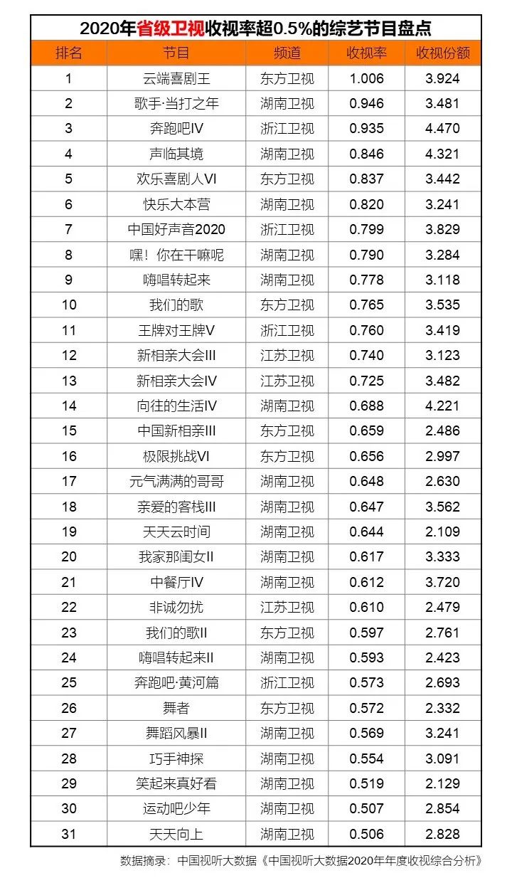 总局大数据显示,2020年省级卫视收视率超0.5%的综艺节目,东方卫视有7档上榜。其中《云端喜剧王》问鼎卫视综艺收视第一,其后分别是《欢乐喜剧人6》《我们的歌》《中国新相亲3》《极限挑战6》《我们的歌2》《舞者》。