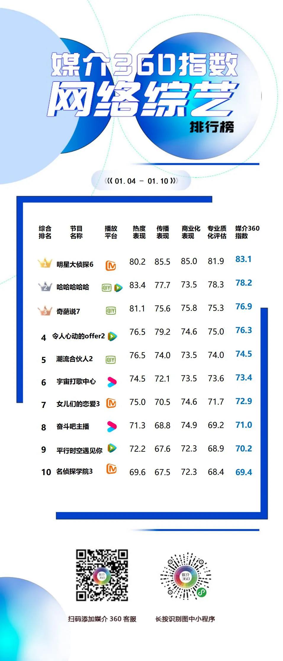 芒果TV《明星大侦探6》热度较高,排名榜单第一;《哈哈哈哈哈》热度依旧,排名榜单第二;爱奇艺《奇葩说7》热度不减,占据榜单第三;腾讯视频《令人心动的offer 2》热度上涨,位列榜单第四;《潮流合伙人2》暂列榜单第五。