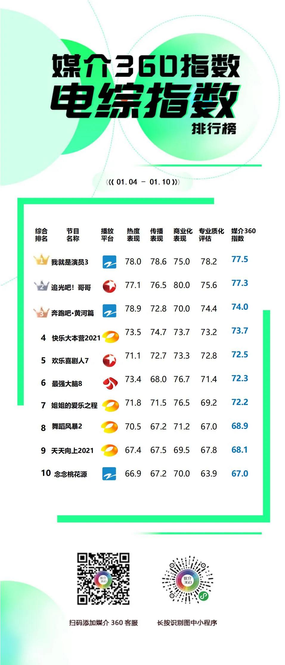 《我就是演员3》叶组新赫子铭带来《拆弹专家》,小沈阳遭灭灯禁演,节目以指数77.5跃居媒介360电综指数周榜第一;《追光吧!哥哥》二公来袭,郑爽惊呼帅气刘敏涛泪目,节目以指数77.3位居媒介360电综指数周榜第二;《奔跑吧·黄河篇》迎来收官,陈学冬、孟子义、薇娅惊喜加盟,节目以指数74.0暂列媒介360电综指数周榜第三。