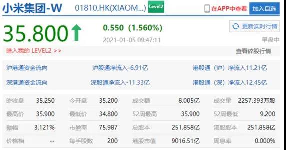 近日,小米集团股价继续高开,市值首次突破9000亿港元,如果小米股价达到36港元,则市值会达到9052亿港元,约1168亿美元。