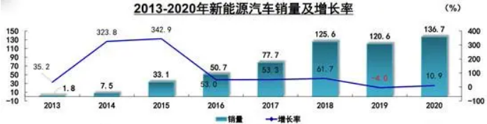 新能源汽车,2020年的产销分别完成136.6万辆和136.7万辆,同比分别增长7.5%和10.9%,增速较上年实现了由负转正,全年市场销量好于预期。