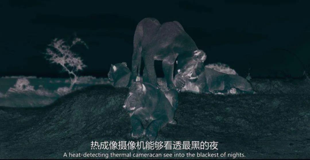 因为是夜间拍摄,不难想象该片在取景过程中是难度极高的,为此摄制组专门动用了多种复杂又高科技的摄像机装备。比如微光摄像机、超敏感摄像机,还有热成像摄像机等,通过它们,就可以记录下人类肉眼无法触及的高清视界。