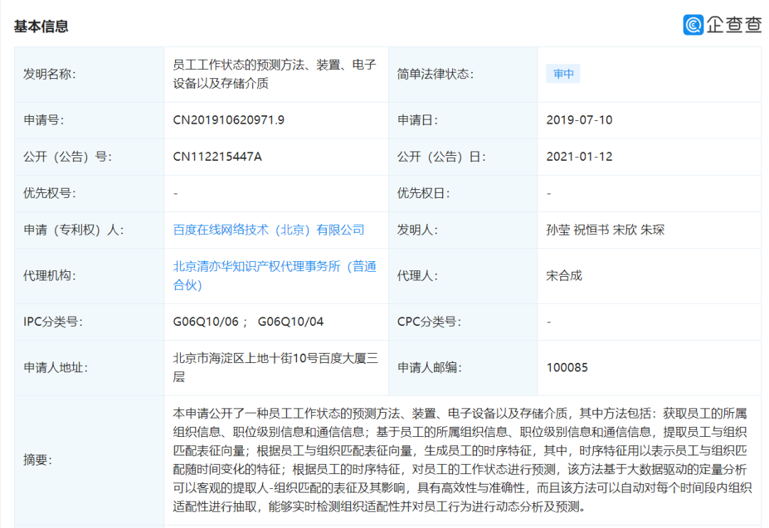 企查查APP显示,近日百度公开一种“员工工作状态预测”相关专利。据悉,百度在线网络技术(北京)有限公司公开专利“员工工作状态的预测方法、装置、电子设备以及存储介质”,公开日期为1月12日,专利公开号为CN112215447A。
