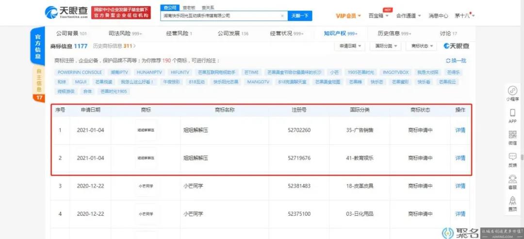 近日,据天眼查公开信息显示,近日,芒果TV关联公司湖南快乐阳光互动娱乐传媒有限公司新增“姐姐解解压”商标,申请日期为2021年1月4日,国际分类涉及广告销售,教育娱乐。商标状态均为“商标申请中”。