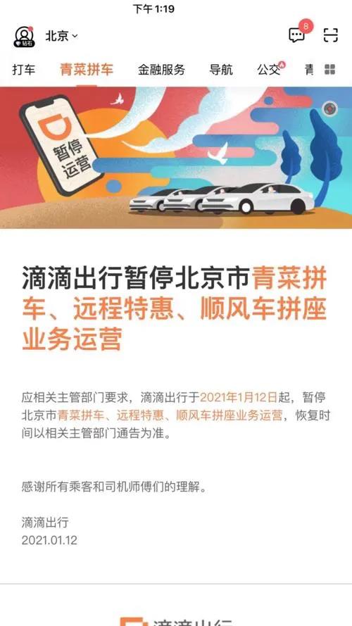 滴滴:今起在京暂停青菜拼车、远程特惠拼车和顺风车拼座功能