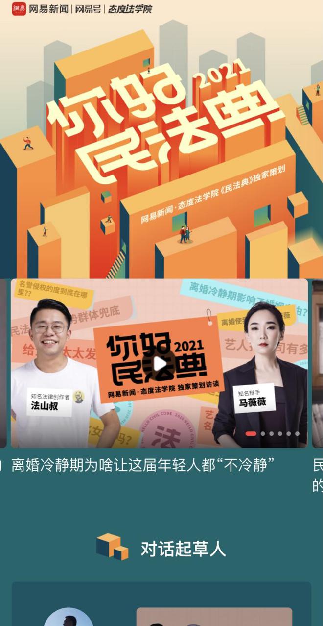 2021年1月1日,《民法典》正式施行。网易新闻·态度法学院发起独家视频策划,联合法治类门户网站正义网,由网易号法律知识创作者对话3位民法典起草人,同时还集结起由100多位网易号法律类视频创作者组成的法律科普团,从继承编、物权编、人格权编、侵权责任编、合同编、婚姻家庭编等方面全面科普新法,此外网易新闻还邀请辩手马薇薇和知名法律博主法山叔展开对谈,用权威、专业、有趣、丰富的视频内容,解读《民法典》将如何影响人们生活的方方面面。