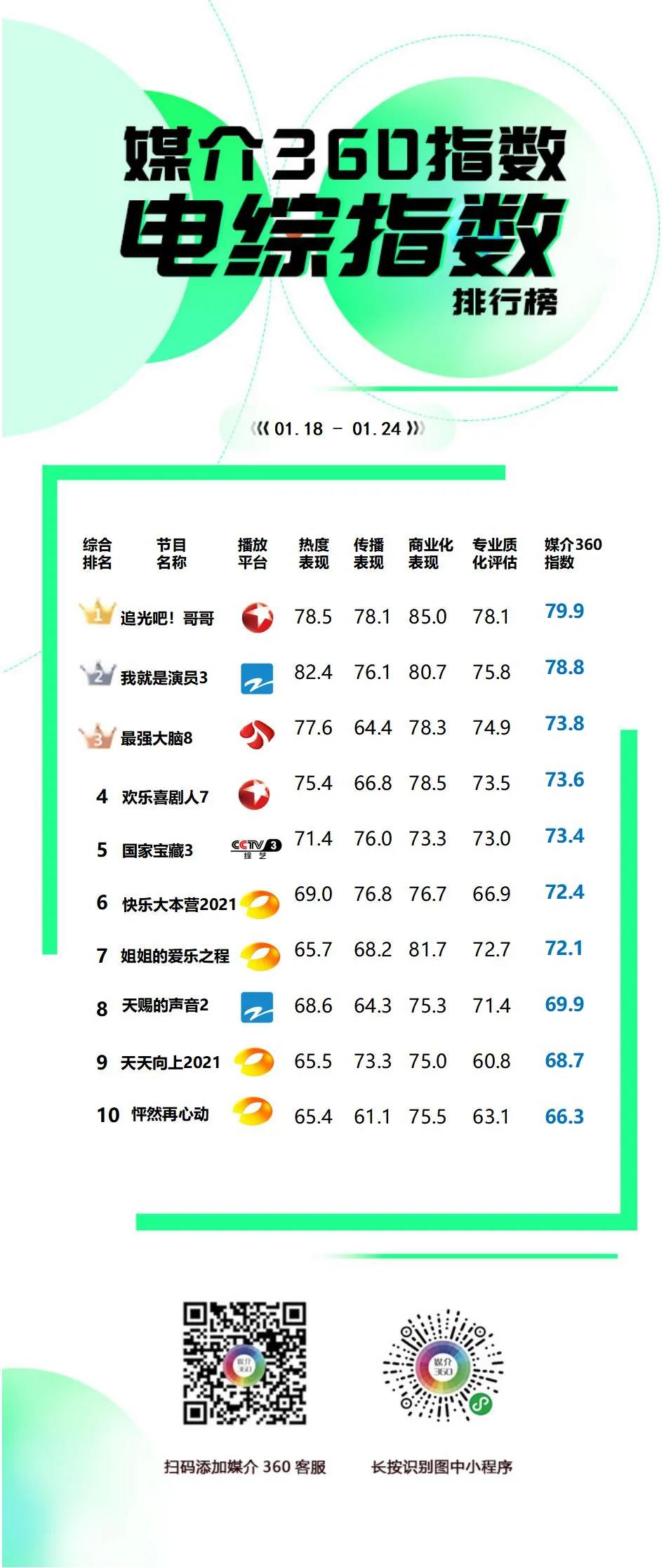 《追光吧!哥哥》》第三次公演结束,李汶翰小组获得第一,完美达成公演三连冠,节目以指数79.9跃居媒介360电综指数周榜第一;《我就是演员3》荒诞喜剧《驴得水》郝蕾“打架式”教学,小沈阳夫妇感动全场,节目以指数78.8位居媒介360电综指数周榜第二;《最强大脑8》王耀庆化身脑力达人,展现惊人观察力和记忆力,节目以指数73.8暂列媒介360电综指数周榜第三。榜单中,《追光吧!哥哥》《我就是演员3》《最强大脑8》分别以较高热度占据本周媒介360指数-电综排行榜TOP3。本周,电综领域整体竞争格局稳定,值得注意的是,湖南卫视熟龄女性甜蜜觅爱社交原创综艺《怦然再心动》一开播引发热议,关注度持续上涨,后续表现值得关注。