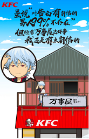 这种玩法多是一方为实体品牌,一方为内容IP,双方或在营销层面,或在在包装设计层面,融入双方品牌的调性,比如肯德基携手经典动漫《银魂》,跨界合作打造出“KFC x 万事屋”与“万事OK明星餐”,以《银魂》世界观对肯德基产品诠释的定制版动画剧情俘获了中国粉丝的心。再比如百事可乐与纽约当红华裔设计师 Alexander Wang的合作,直接开启了百事可乐“黑化”之旅。