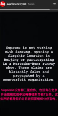 2018年12月10日,三星A8s发布会上宣布与潮牌Supreme合作,还宣称双方将深入电商平台再开几个实体店,但Supreme赶紧在官网发了个声明从头到尾的否认了这则消息。