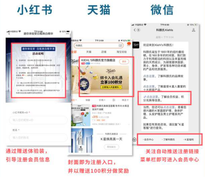 下图中间就是用户在天猫上搜索科颜氏时呈现的商城封面,在用户的第一眼中,他们首先放上引导注册会员信息,并借此获取用户的手机号。同样的事情也发生在小红书、微信、微博上。