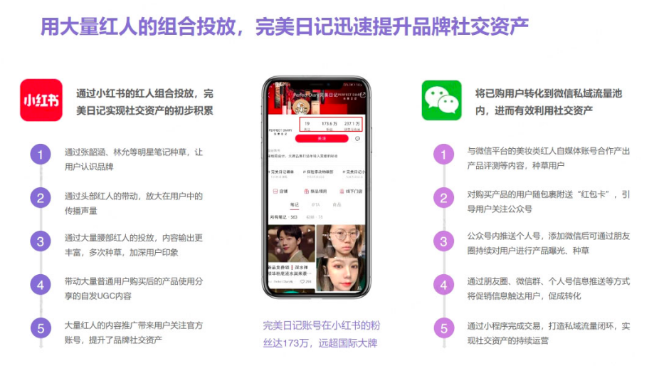 截至目前,完美日记在小红书的官方账号坐拥173万粉丝,在小红书上搜索“完美日记”,可以看到有11万篇以上的笔记分享。而在这11万篇的笔记当中,可以看出完美日记进行分层投放的端倪——明星负责种草,美妆KOL负责引导,素人通过分享使用心得进行二次传播。除了小红书之外,B站也成为了完美日记营销的重要渠道之一。
