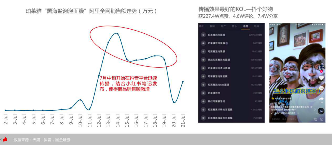 例如珀莱雅,以抖音短视频为切入点,与大量KOL合作进行传播带货,同时结合小红书、微博等内容平台。上进行宣传推广,产品声量迅速放大,2019年7月珀莱雅“泡泡面膜”销量位列7月天猫面膜单品第一名。