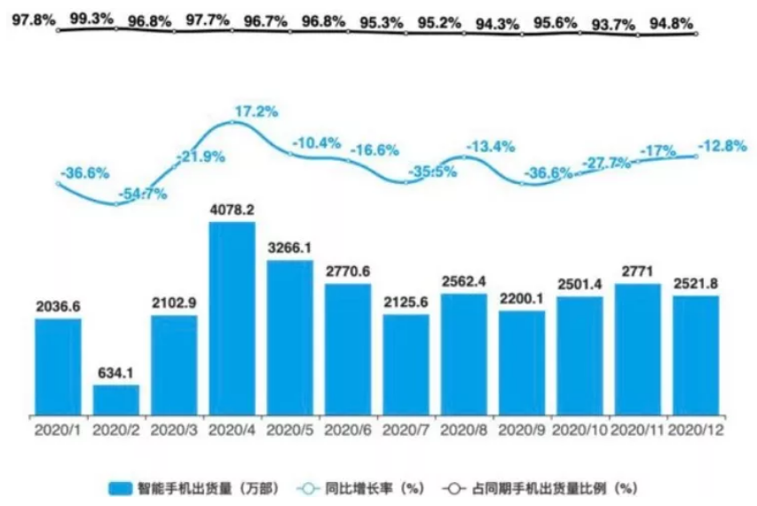 2020年手机市场销量大幅下滑,创下近些年新低。根据中国信通院发布的国内手机市场运行分析报告,2020手机市场总体出货量累计3.08亿部,同比下降20.8%。