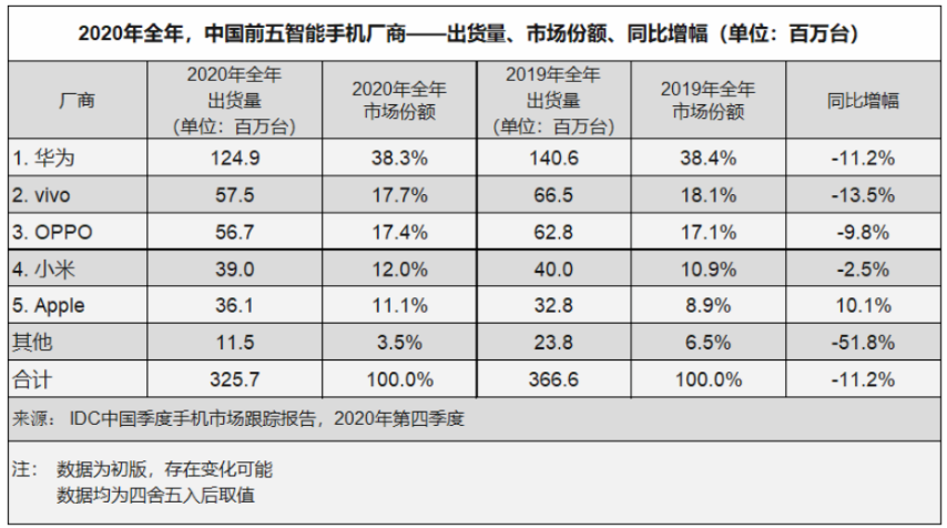 IDC公布的《2020全年中国市场的智能手机出货量》显示,华为手机出货量1.25亿台,销量同比下滑11.2%,市场份额依旧达到了38.4%;随后便是vivo、OPPO、小米、苹果,全年手机出货量分别达到了5750万台、5670万台和3900万台。除苹果外,四大国产手机厂商国内销量都出现了下滑迹象。