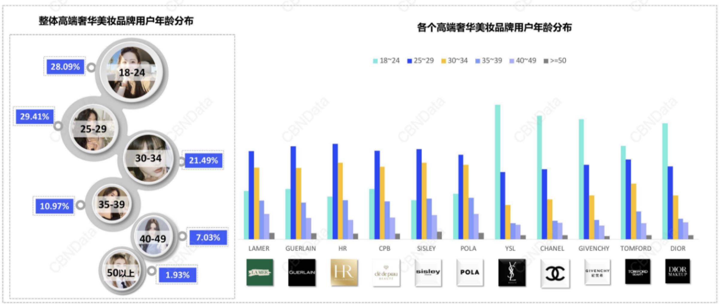 《2020高端奢华美妆品牌消费趋势报告》数据显示,高端奢华美妆品牌用户呈现年轻化趋势。18至24岁占据了28%,25-29岁占据29.41%,30-34岁占比21.49%。YSL、CHANEL、GIVENCHY和DIOR则超过40%的消费者为95后。