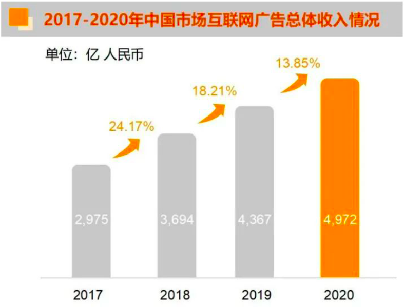 中关村互动营销实验室数据显示,2020年中国互联网克服全球疫情的严重影响,互联网广告全年收入4971.61亿元(不包含港澳台地区),比2019年度增长13.85%,增幅较上年减缓4.35个百分点,仍维持增长态势。