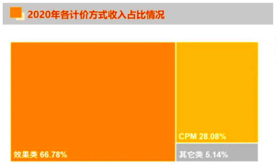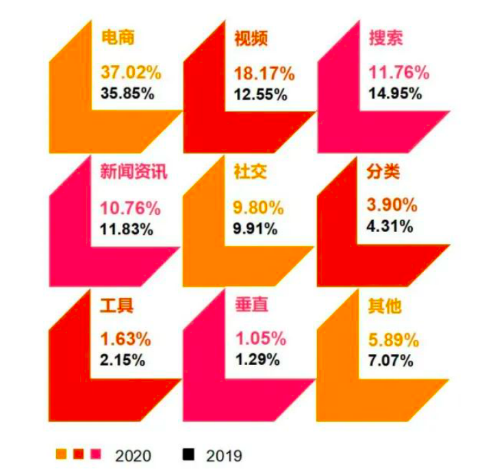 从广告形式收入占比情况看,展示类与电商广告维持了2019年的市场份额,搜索类广告持续势微,市场占比连续两年下滑至13.4%,相比之下在短视频的强力助攻下,视频类广告继续强势增长,年增速达45.4%。