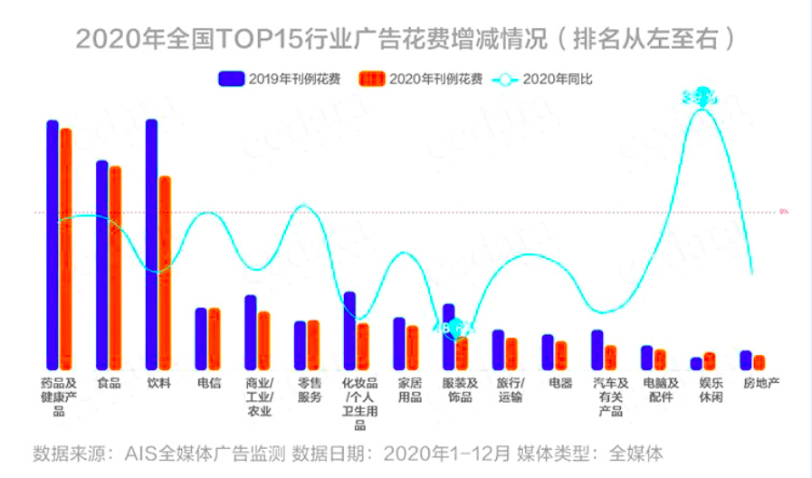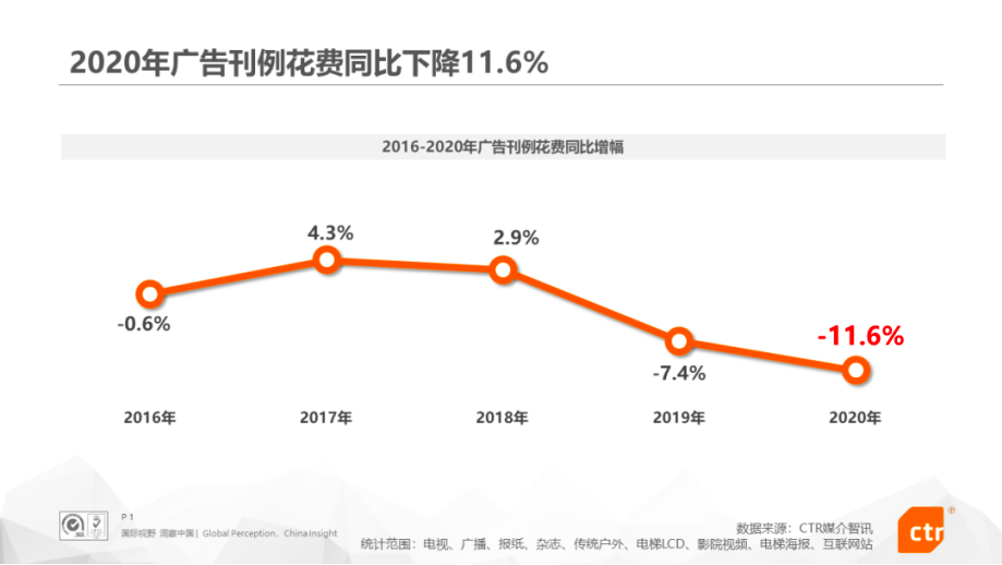 CTR的报告显示,疫情发生后整个广告市场出现应激反应,2020年中国广告刊例花费同比下降11.6%。