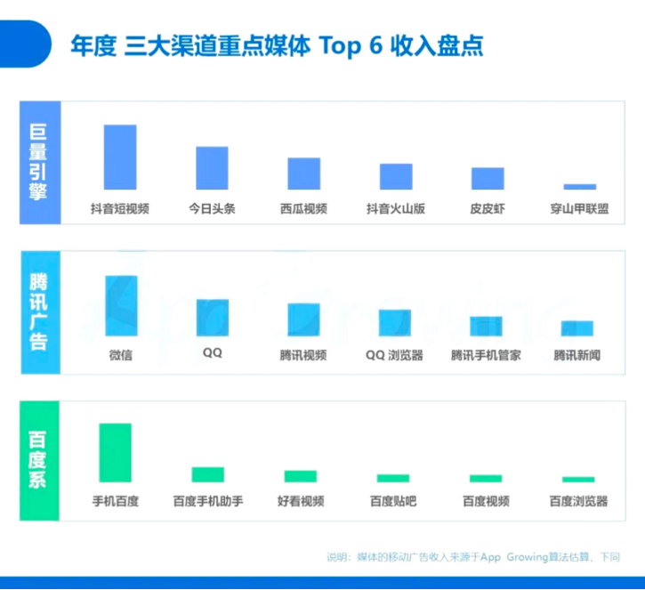 具体到各重点渠道,巨量引擎、腾讯广告旗下的重点媒体收入都较高,而百度系的手机百度收入远超第二名,头部效应明显。