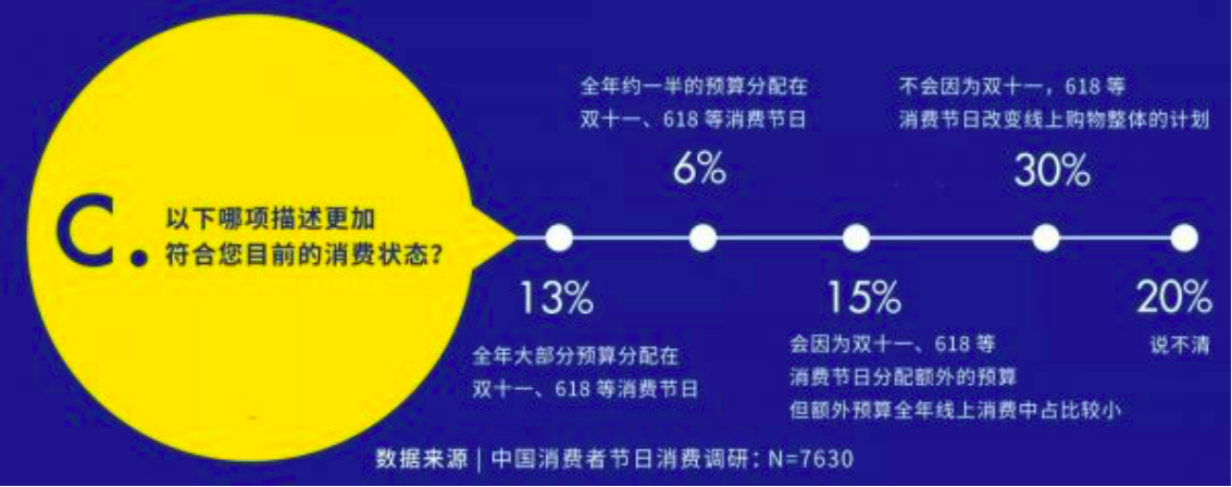 电商节日的兴起已经在很大程度上影响了中国市场的消费结构:接近四成的中国消费者会因为电商节日分配额外的购物预算,同时13%的消费者表示他们会把全年的大部分消费预算分配在双十一这样的消费节点。在许多商家节后保价的承诺下,节日囤货的文化已经悄然形成,电商节日在品牌整体节日营销的规划中也正在占据愈发重要的位置。