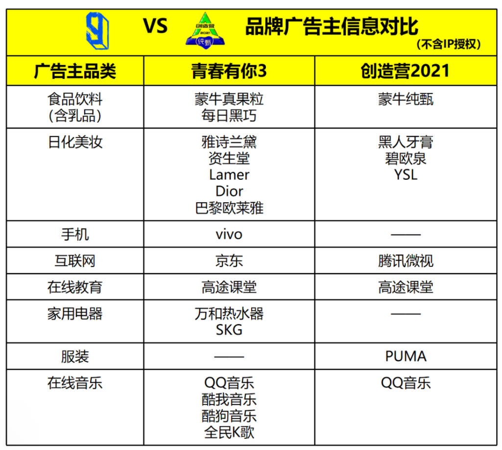纵观两档节目的广告主信息,我们发现,这两档王牌网N代所吸引的蒙牛、vivo、黑人牙膏、京东、PUMA等品牌,早就是选秀综艺的“常客”。