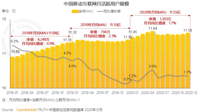 《中国移动互联网年度大报告》数据显示,移动互联网流量接近饱和,同比增速持续下滑,月均同比增速从2019年的2.3%下降到2020年的1.7%,移动互联网进入存量竞争时代。