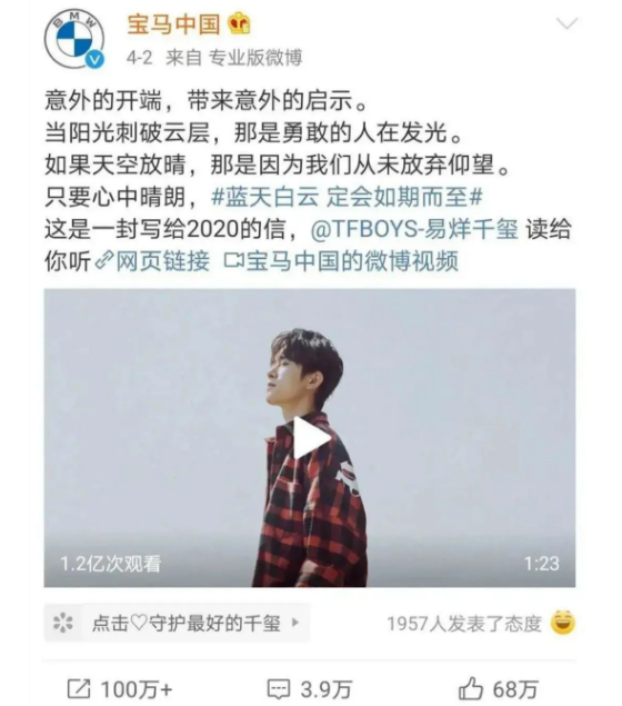 宝马中国选择易烊千玺为BMW新生代代言人,同时也是宝马的首位代言人。从粉丝反馈来看,宝马中国微博在官宣当天收获了百万转发与点赞。评论区几乎成了宝马的车展,粉丝花式晒车感谢品牌方的选择。