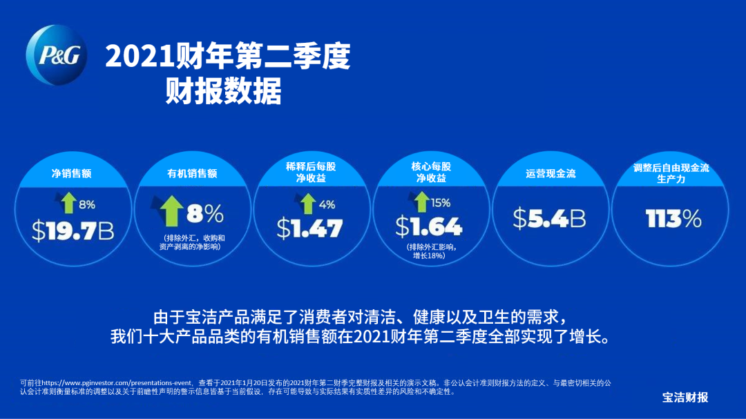 1、2021财年第二季度,宝洁净销售额197.45亿美元,同比增长8%;
