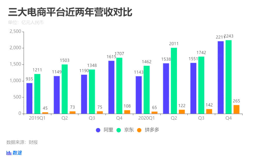 京东一直处于第一的位置,尤其是在2020年,有6.18的第二季度和有双11的第四季度,京东的营收规模均超过了2000亿元大关。