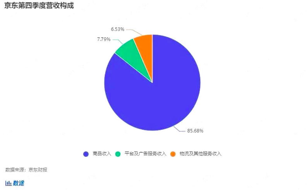 京东的业务主要分成商品收入和服务收入,其中商品收入占比为85.68%,去年同期为87.7%;物流收入占比6.53%,去年同期为4.39%,这说明京东也正在改善自己营收结构过于单一的情况,在这个大背景下,物流服务正在快速崛起。