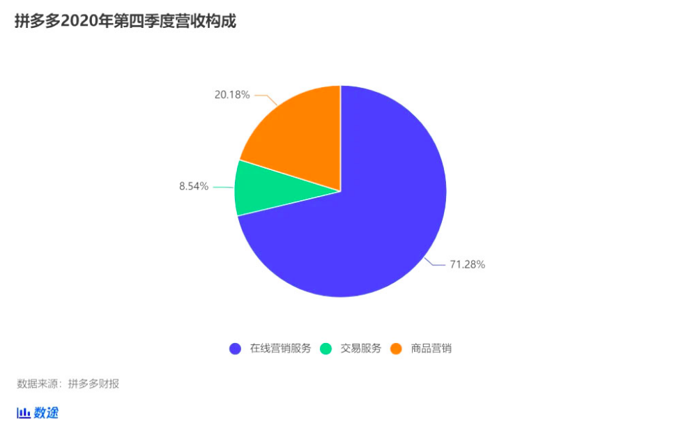 拼多多的营收构成则相对单一,虽然财报上是按照三项业务划分,但这三项业务实际上都和电商相关。