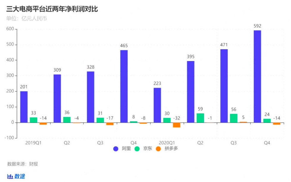 阿里是三家公司当中名副其实的吸金王,尤其是在去年第四季度,阿里巴巴净利润创下历史新高,直逼600亿元大关。