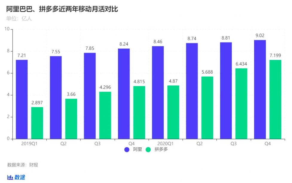由于京东不公布其移动端的活跃用户数,下图就以阿里巴巴和拼多多进行对比。