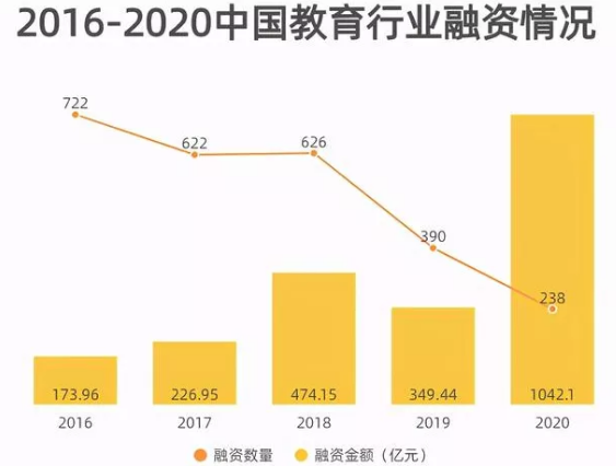据IT橘子数据,2020年国内教育行业公布的融资事件共238起,2016年~2020年,教育行业融资总额分别为174亿元、227亿元、474亿元、349亿元、1042亿元。