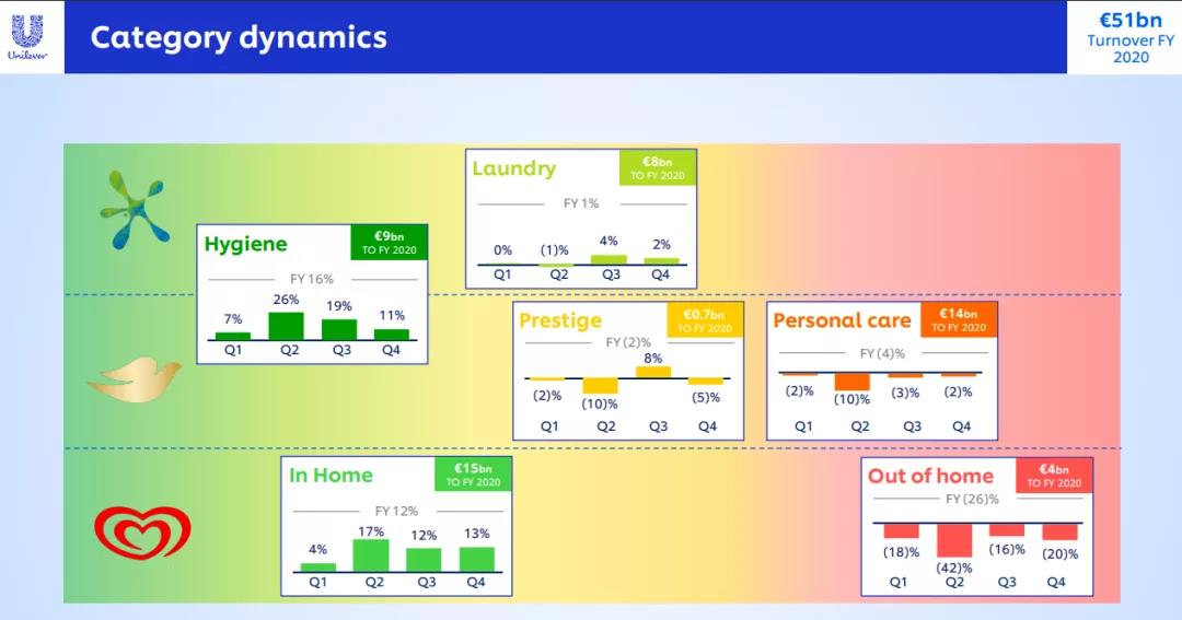 由于受疫情之下关店潮的影响,联合利华的高端化妆品销售额同比下滑2%,但因为抓住了在线渠道的需求,其电商渠道增长了61%。而在产品结构方面,宝洁美容个护业务营收211欧元(约合1633亿元),占比公司营收份额最高,产品销售额、销量均实现微增。值得一提的是,2020年,中国市场为联合利华贡献了28亿欧元(约合217亿元)销售额,实现低个位数增长。