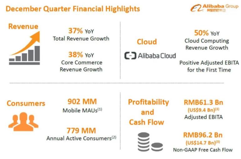 阿里巴巴方面表示,这一财季营收的增长主要得益于中国商业零售业务和阿里云板块收入增长的拉动。财报显示,阿里中国商业零售业务该季度收入1536.79亿元,同比增长39%;阿里云收入161.15亿元,同比增长50%,也是该业务历史上第一次扭亏为盈(以经调整EBITA为标准)。值得一提的是,阿里在收购高鑫零售之后,新零售业务营收517.6亿元,同比增长101%,占比该季度总营收的23%,后续表现值得期待。