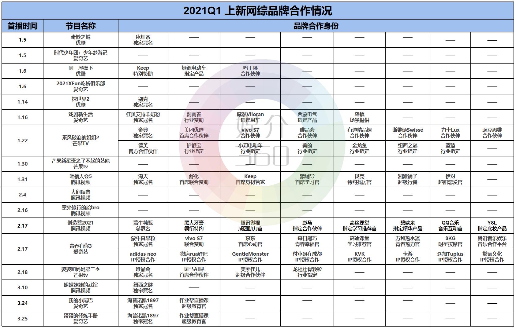 除了上述亮点之外,据媒介360实时统计,Q1新上网综共计17档,其中爱、优、腾、芒上新数量相差无几。值得一提的是,在Q1上新的17档节目,总共吸引65次品牌,其中有不少品牌也是选择与优质内容IP再度携手。究竟,整体Q1网综品牌合作情况在各个行业赛道上有什么不一样的景象?