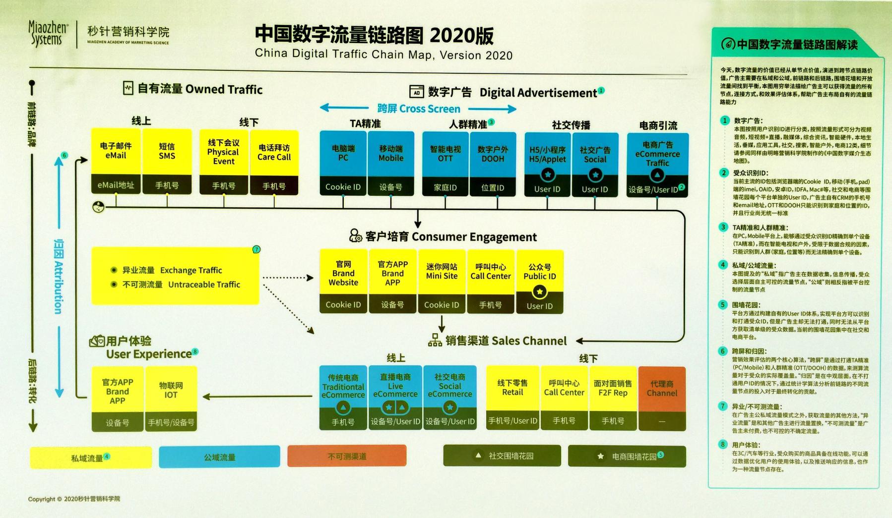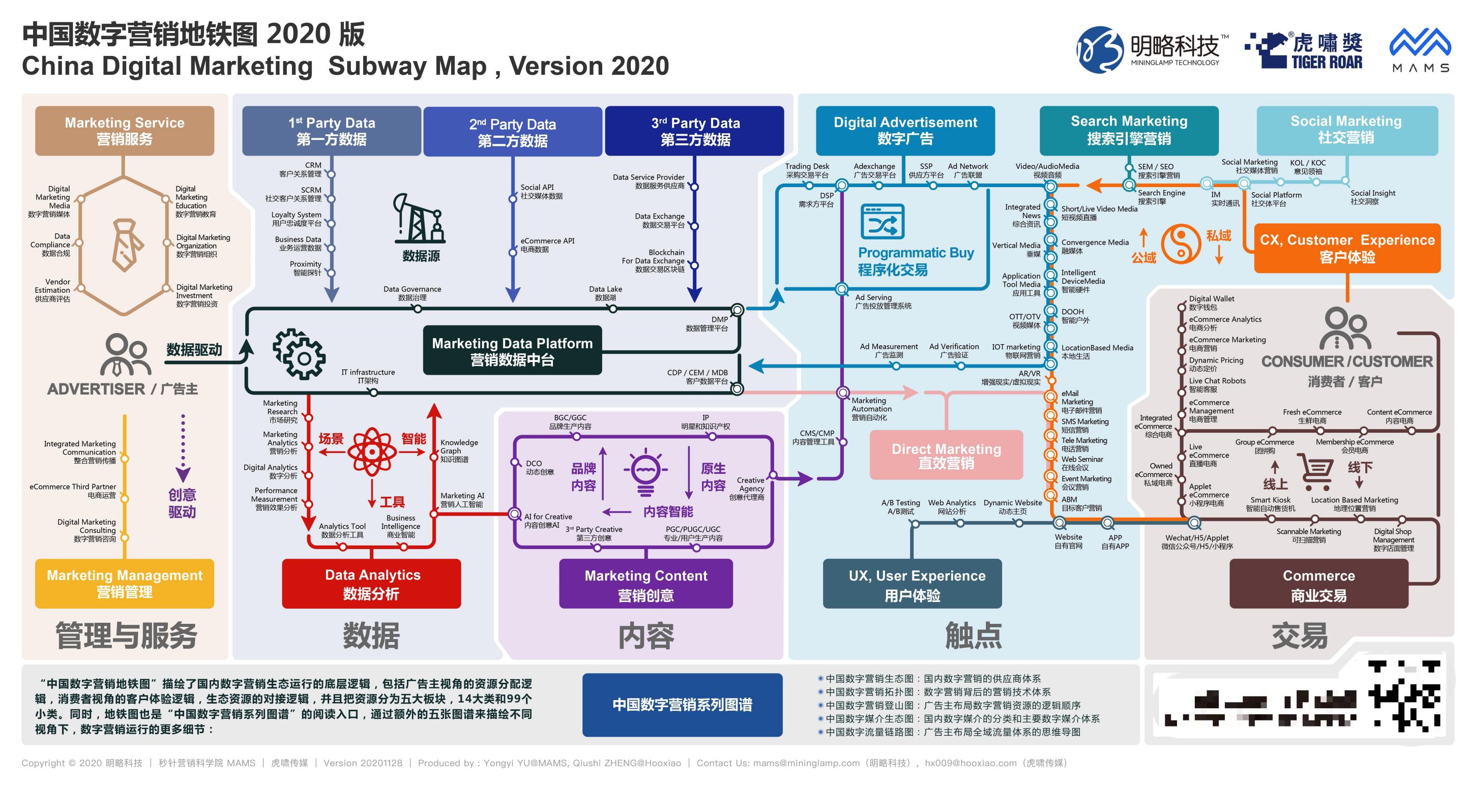 本文,我们参考明略科技秒针营销科学院的数字营销生态图,以及易观分析的私域流量运营生态图,从数据、触点、交易、内容等“消费者旅程”(Customer Journey)的关键要素入手,打通公域流量和私域流量,力求完整梳理数字营销的所有资源碎片,以及“广告测量”,“数据中台”,“营销自动化”,“营销人工智能”等资源碎片背后的技术框架,还原出中国营销广告传播行业的知识图谱。